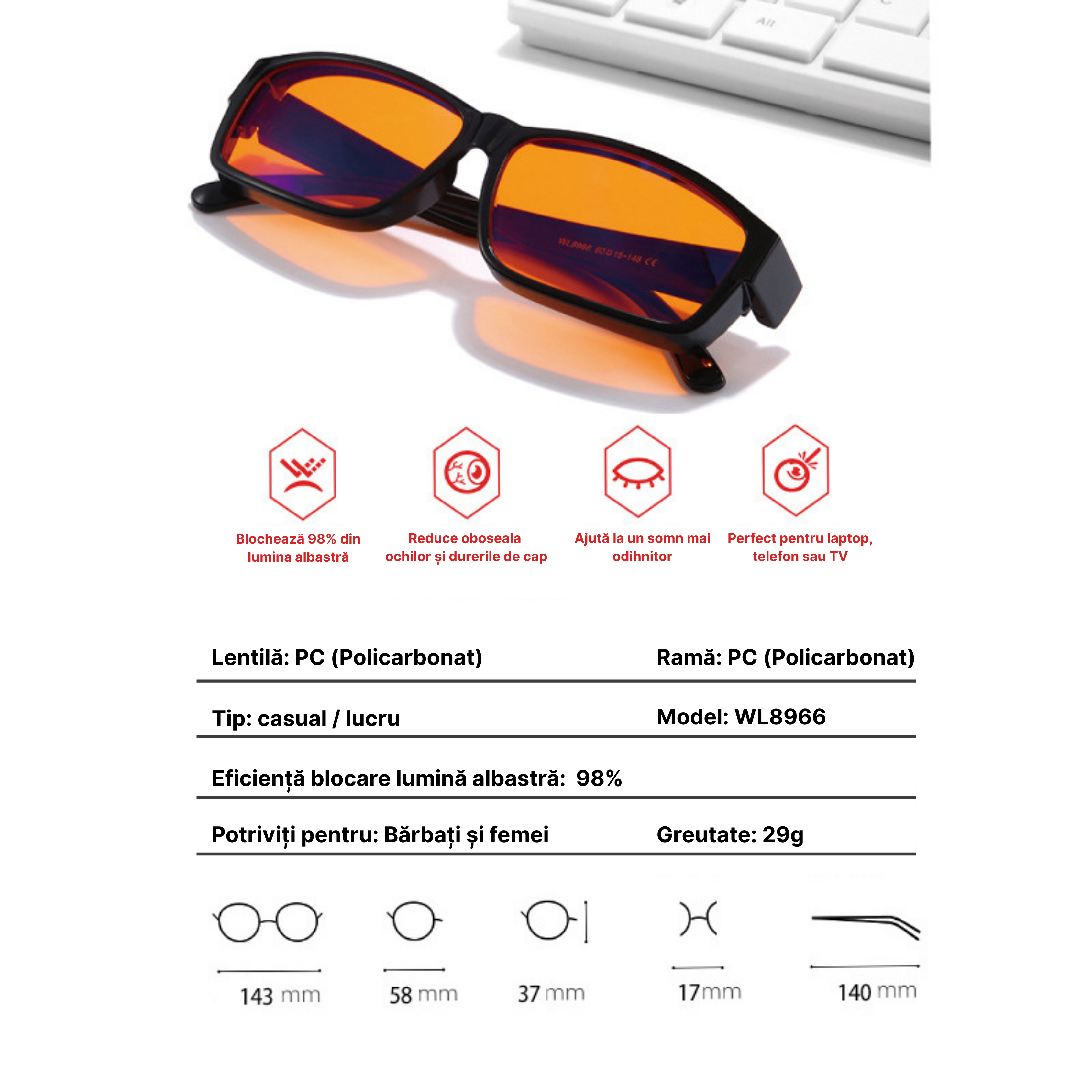 Lentilele au un filtru portocaliu care reduce spectrul dăunător de lumină.